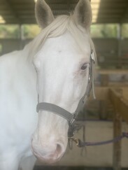 At 15hh, Cream Puff is a spring chicken and blessed with an amazing colour called a Cremello. She has what's called a 'cream gene' which can produce several different coat colours. The main effect is that the gene produces a lighter eye, skin and coat.